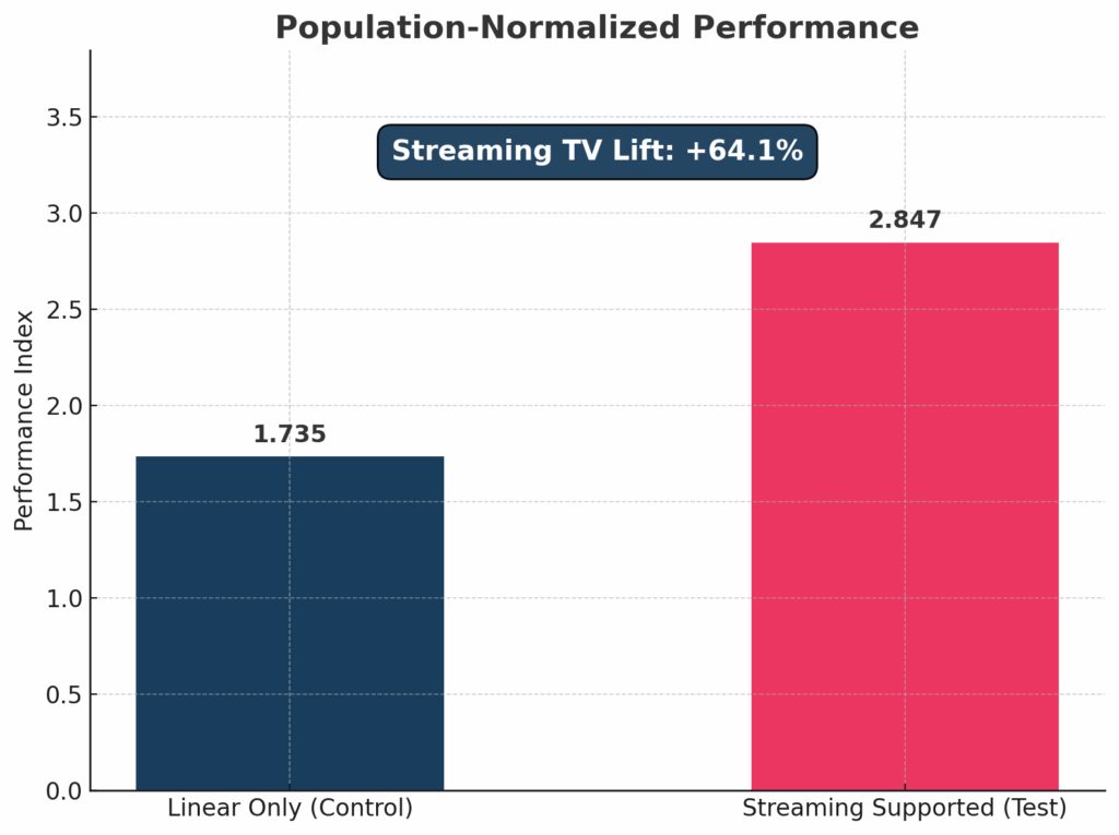To ensure that the data wasn’t skewed by population differences (since one zip code could have 10,000 residents and another 50,000), we applied Population Normalization—measuring sales per 1,000 residents. This approach gave a true apples-to-apples view of performance and allowed us to clearly see the incremental effect of adding streaming to linear buys.